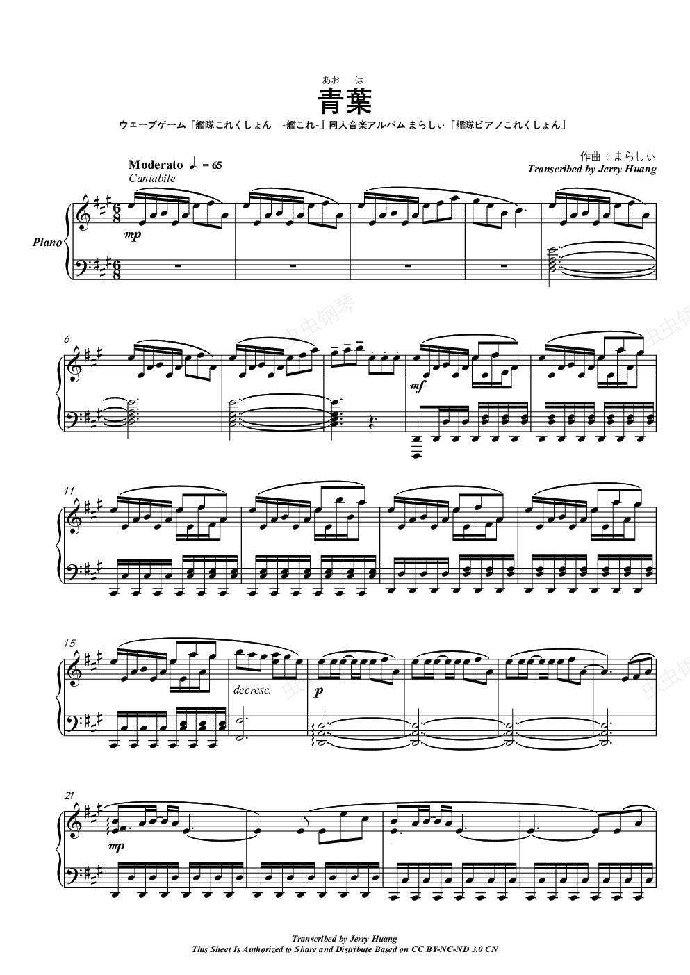 写在前面:改了这么多次,万分抱歉,还请管理员大大原谅>_<有dalao反映错音太多,所以又重新听了几遍,发现错音确实很多TAT...所以做了一个V1.1版本,请各位dalao原谅>_<。最近被舰C春活虐得(被水淹没)不知所措,所以想做个舰娘的谱子攒一些人品(笑)。试听已经经过本人爱的调♂教,尽量保留了原曲的味道,请各位放心食用~这首《青葉》收录于触手猴作曲、编曲、演奏、在C87上发售的网页游戏《舰队》的同人音乐专辑,是触手猴的一首原创曲。在这个专辑中,有一部分曲目是猴哥对《舰队》BGM进行钢琴编曲的版本,如《母港》(母港BGM)、《出撃(海原超えて)》(出击界面BGM)、《昼戦(砲雷撃戦、始め!)》(通常关卡昼战BGM)、《鎮守府の午後(模様替え)》(装扮界面BGM)等,还有一部分是猴哥的原创曲,如《金剛》(こんごう)、《翔鶴》(しょうかく)、《榛名》(はるな)、《うちのエースの雪風ちゃん》以及这首《青葉》。———————————————————————————————————————————————————————————— 曲名和历史考据相关:「青葉」(あおば),是二战时期旧日本海军(英语 Navy (IJN),日语:大日本帝国海軍(だいにほんていこくかいぐん))一等巡洋舰、青叶级重巡洋舰一号舰。根据旧日本海军的舰船命名规则,一等巡洋舰(即重巡洋舰)的名称取自山峰名,“青叶”的舰名来自位于京都府舞鹤市加佐郡和福井县大饭郡高滨町之间的青叶山。由于是老式重巡的缘故,青叶在游戏中的各项数值不如一线新锐重巡,但由于是史实中的武勋舰,而且活到了终战,所以最大的特征是有比其他重巡更高的运值。特高的运值给予青叶的优势就是强力的夜战,加上重巡夜战特化的能力,青叶的夜战暴击伤害可以达到400+,可谓夜战的王牌杀手。———————————————————————————————————————————————————————————— 为dalao们提供参考的和声和编曲分析:这首曲子最大的亮点在于:一是V7-I,即属七和弦接主和弦的解决方法。二是大量运用借用和弦(调式互换)的技巧,以达到顺畅的转调效果。借用和弦的关键在于互相借用的两个调性互为大小调关系,此时两个调性中的和弦可以相互替换,达到一种出乎意料的和声效果。比如,第40小节到第47小节的转调逻辑是:A大调→C大调(a小调)→降E大调(c小调)→C大调(a小调)→A大调,再如57小节到65小节的转调逻辑是:A大调→C大调(a小调)→降E大调(c小调)→降G大调(降e小调)→A大调(降G小调)。由于大小调之间的主和弦根音正好相差3个半音(如Am和C),而一个八度中有12个半音,所以经过4次借用后正好能回到原调。编曲上,左手织部依然是猴哥喜欢用的八度和十度交替演奏的设计,这样的好处就是可以很方便制造很好的低音部的混响效果,而且不失节奏感(虽然高音演奏得并不明显,但由于Ghost Notes的存在,可以制造一种心理上的节奏感)。尤其是十度交替演奏的方法,这个多出来的三度音有一种很棒的泛音效果,可以增加明亮感。———————————————————————————————————————————————————————————— 最后也祝愿各位提督能邂逅伊13和意大利船、捞到新船、通关E5、道中不掉沟、门神不劝退、一次斩杀BOSS!祝各位提督武运昌隆!图片来源:重巡洋艦 青葉,p站id ———————————————————————————————————————————————————————————— [IMG]/pu/2017/5/10/__9267_10034_[/IMG]