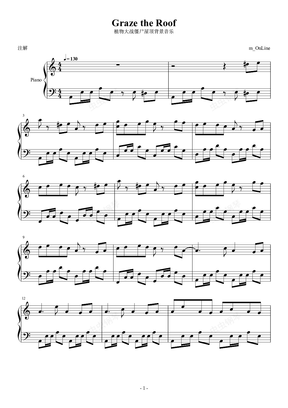 钢琴谱:植物大战僵尸屋顶背景音乐(Graze the roof)