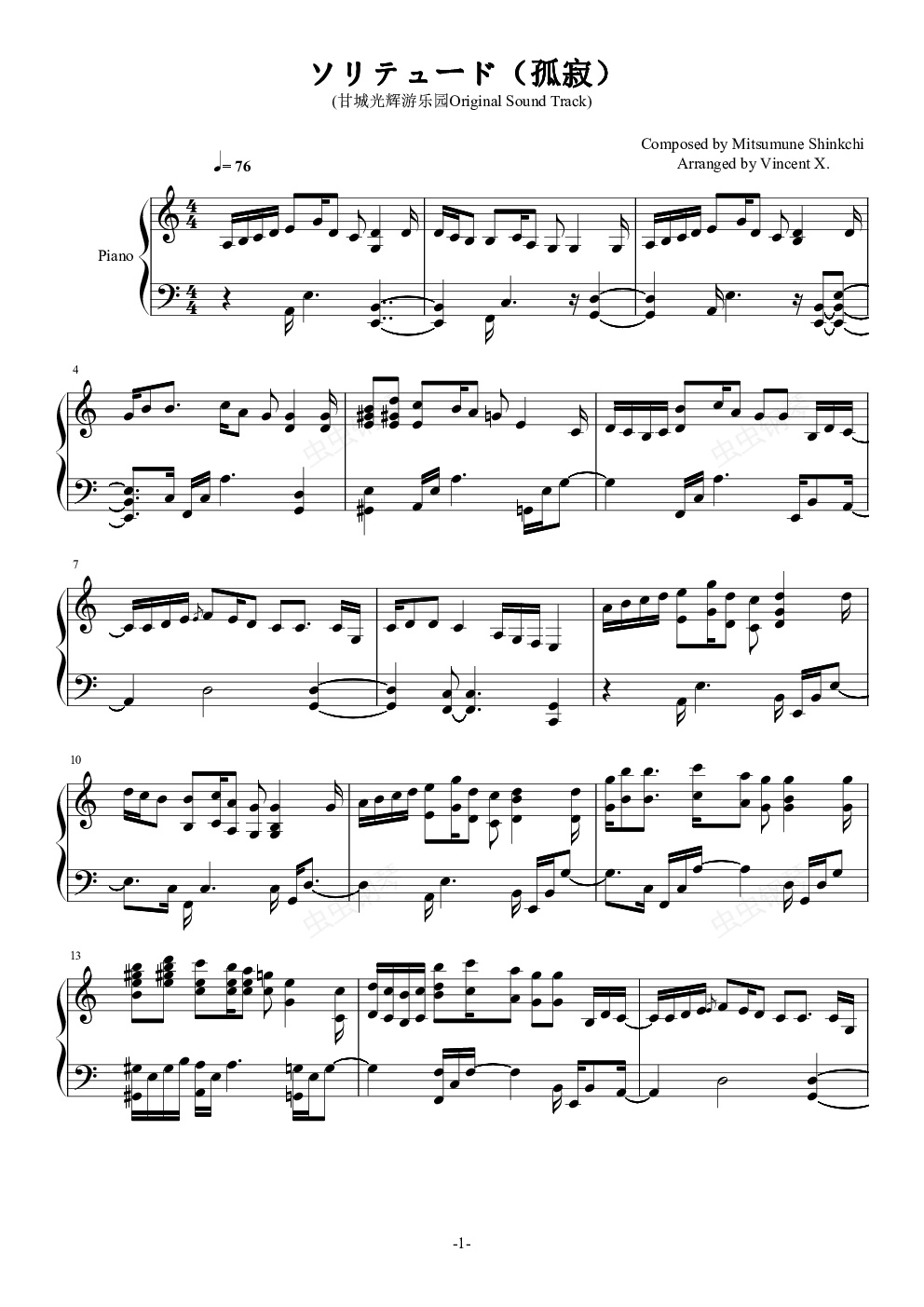 钢琴谱:甘城光辉游乐园OST——ソリテュード(孤寂)