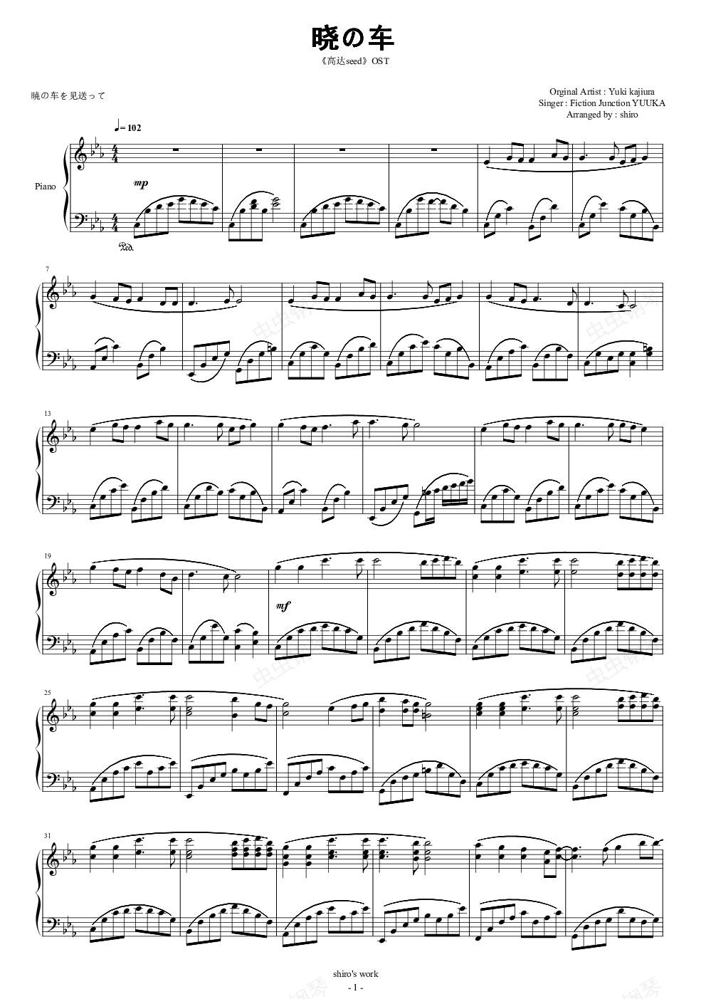 [IMG]/pu/2017/10/30/__5737__[/IMG]前一阵看直播的时候才听到了这首神曲...怎么说,这是我听过最好听的C小调的曲目之一。看了看竟然是02年梶浦大佬的配乐,过了15年竟然还是那么好听啊,也非常符合剧中的情节。。。所以这几天抽空就编了一个比较适合独奏的谱,由于原曲的原因,后面左手略鬼畜233,可以说是左手琶音练习曲了。。///////////////2017.11.05:更新了一下谱面,感觉最后一页有一行太浪费了。。麻烦管理员大大咯