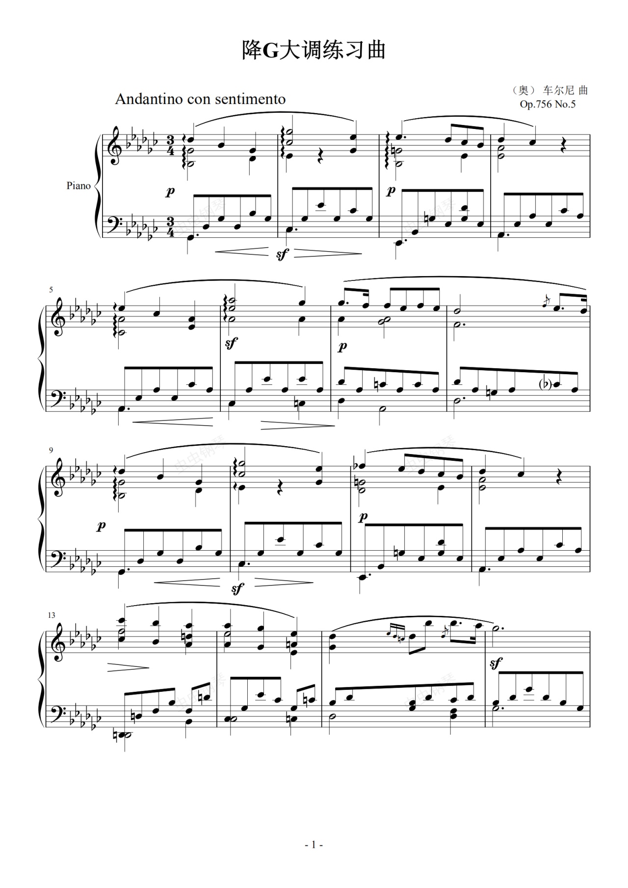 钢琴谱:车尔尼 降G大调练习曲 Op.756 No.5