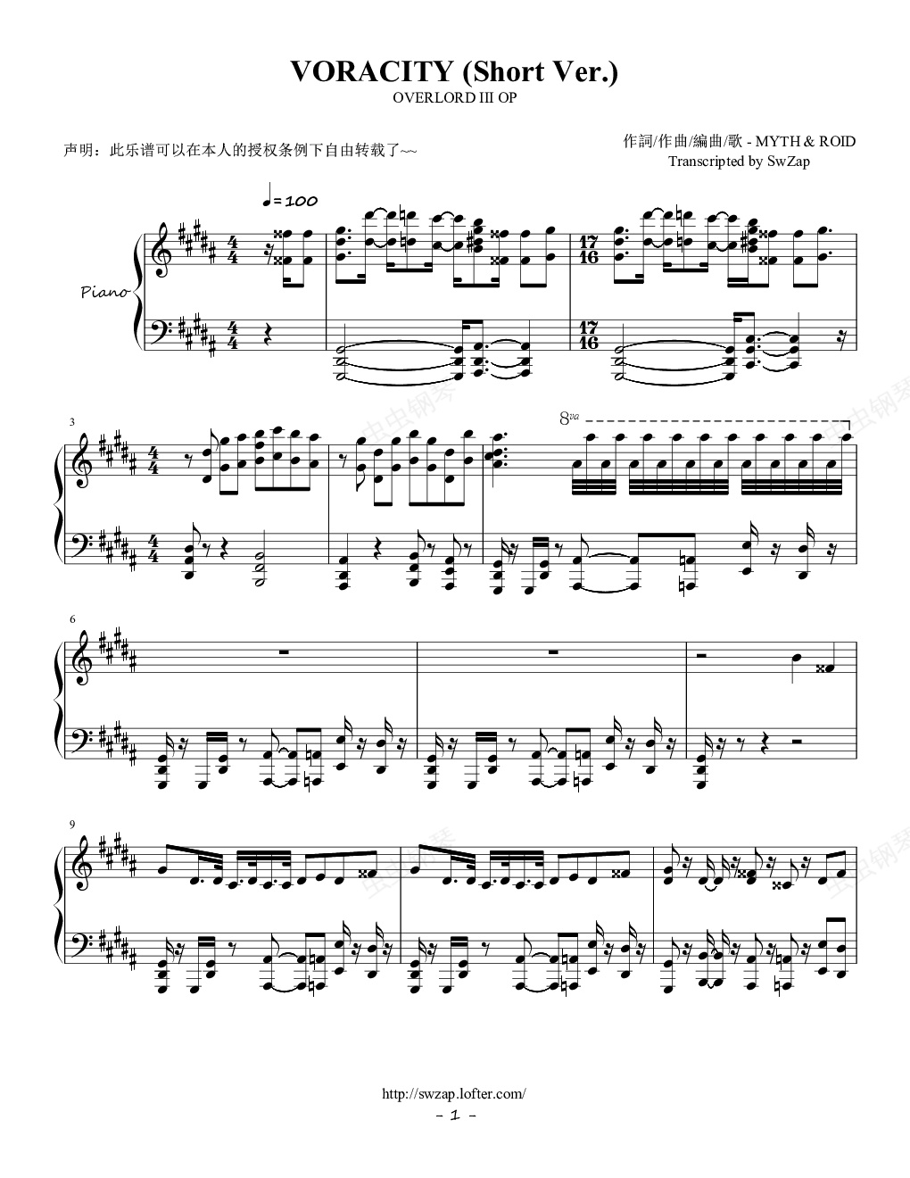 关于谱子中间复杂的17/16和15/16说两句:虽然可以通过比如说变速度或者延音的方式来解决,但是它们都不如分数来得优美。变速的话会出现小数,而延音无法解释为什么都是准确地延长一个十六分音符,而且没办法解决15/16拍小节的问题(不知道有没有什么符号能表示让一个音弹得比普通时值短的。。。)而变换节拍可以让bpm完全保持不变(一直都是100);和重叠起来听,就可以发现所有的节奏可以做到出人意料的一致。。。。。。另外,这不是我遇到的第一首这样搞的曲子,之前《时钟机关之星》的ED也有出现15/16配合一个17/16的情况。。。。让人不禁怀疑这是一种特殊的作曲手段。。。。。B站求支持:/video//MP3下载见:/lpost/1[IFR]///?aid=[/IFR]