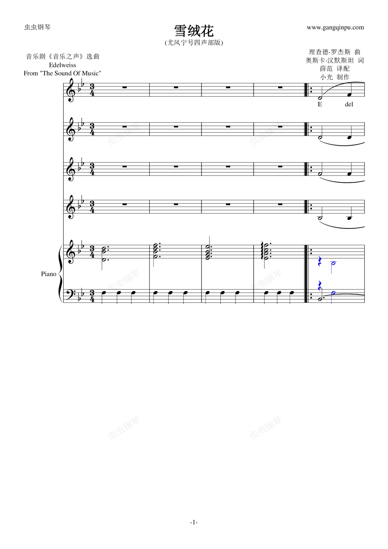 钢琴谱:雪绒花(尤风宁号四声部版)