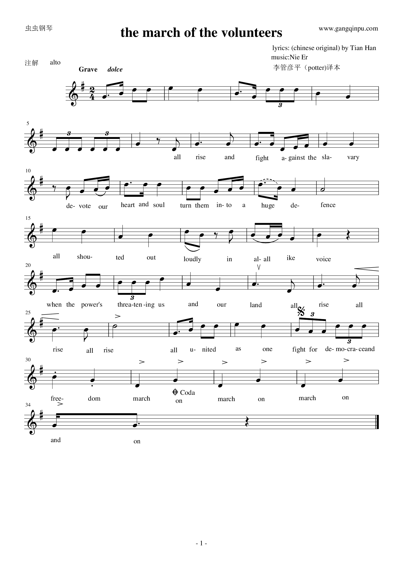 钢琴谱:义勇军进行曲(英文版)