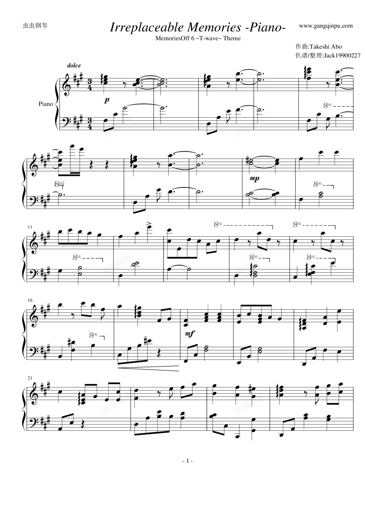 钢琴谱:【秋之回忆6】Theme - Irreplaceable Memories -Piano-
