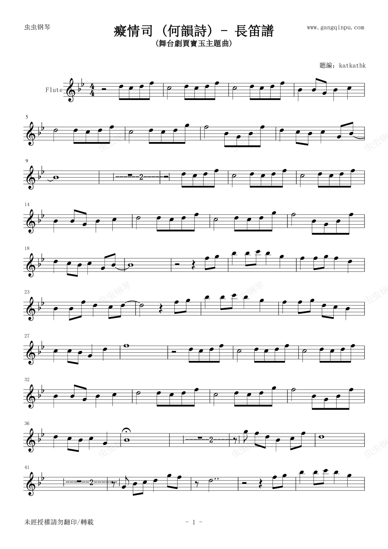 钢琴谱:何韻詩 癡情司 長笛譜 Bb調