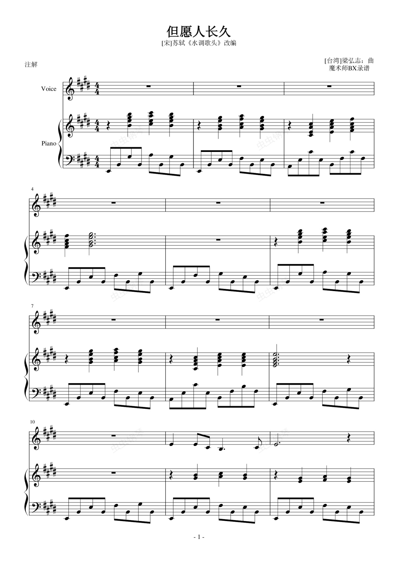 钢琴谱:明月几时有(弹唱版)