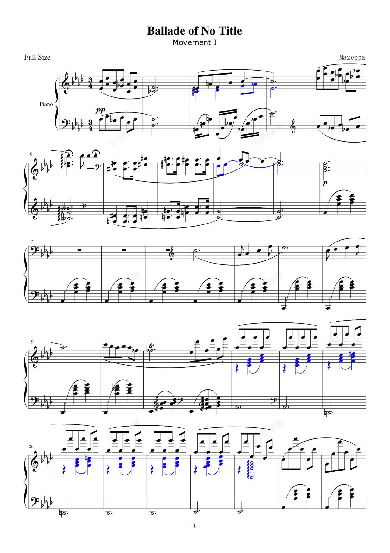 终于要传新作品了么。。。好久都没有传过曲谱了,见最近虫虫上比较冷清,老七来了方才有一点活力。之前上传过一首《忧郁华尔兹》,某洒说过是我的一首21min的叙事曲里面的片段。鉴于原曲全部谱子做出来的话ove将会有1M那么大,而MP3试听则更是有四五十兆了,而且原曲四个部分风格差别很大,所以分成四个乐章较为合适。本次上传的第一乐章是原来整首曲子比较沉闷的前半部分,某洒自己弹得时候也想自己赶快把这部分弹完。顺便剧透一下,某洒的《忧郁华尔兹》将会在接下来的第二乐章(“启航”)中出现。整首曲子(四个乐章连起来)难度有点大,各位虫友有兴趣的可以字迹连起来弹一下(本来就是这样的。。。)