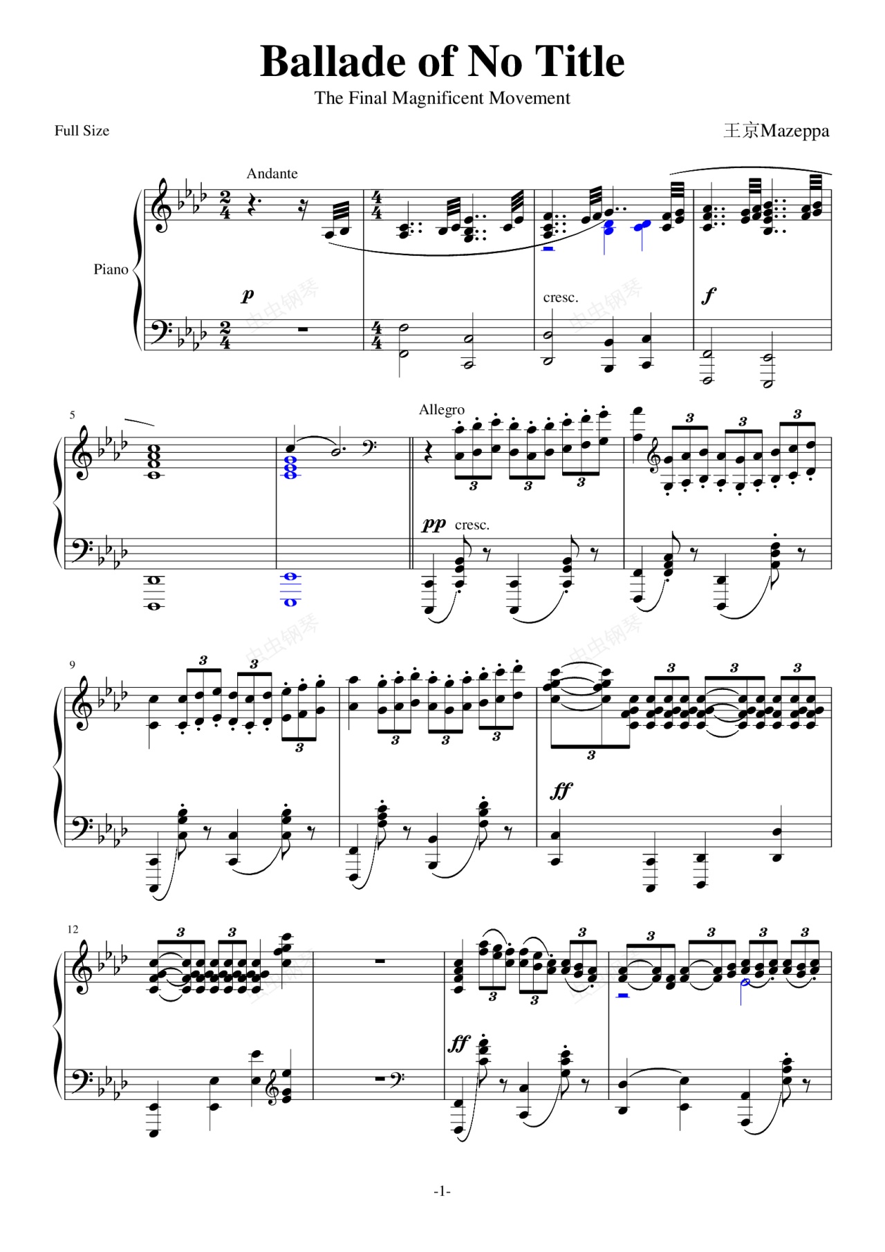 啊咧,终于到了华丽终章了。这次的无题诗系列的曲谱发布就到此结束。还是那句话,这是一首20min的单曲,只不过考虑到曲谱大小的关系,我把它分成了四个乐章来上传。非常感谢各位的支持。嘛,在初章里面的主旋律大家是不是好久不见了呢?在华丽终章里面除了有在“远涯孤舟”里面剧透过的旋律以外,在初章里面那有一种酒吧感觉的主旋律在这里也将会以另一种“英雄气概式”的形式来再现。最后再说一句,这首曲子我是完整弹下来了的,本来想再上传一首自己弹的,但是无奈电脑的话筒坏掉了就无法实现。。。最后,曲子不好,请慢用。。。