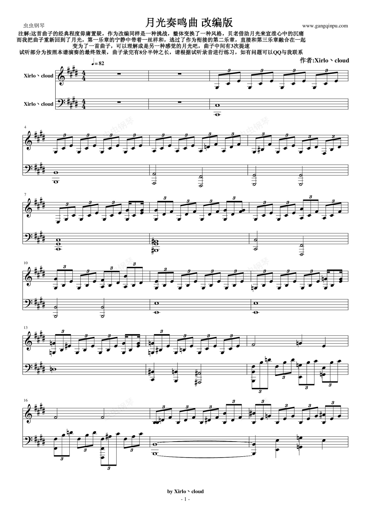 这首曲子的经典程度毋庸置疑,作为改编同样是一种挑战,整体变换了一种风格,贝老借助月光来宣泄心中的沉痛,而我把曲子重新回到了月光,第一乐章的宁静中带着一丝祥和,逃过了作为衔接的第二乐章,直接和第三乐章融合在一起,变为了一首曲子,可以理解成是另一种感觉的月光吧,曲子中间有3次提速,试听部分为按照本谱演奏的最终效果,曲子录完有8分半钟之长,请根据试听录音进行练习,如有问题可以QQ与我联系