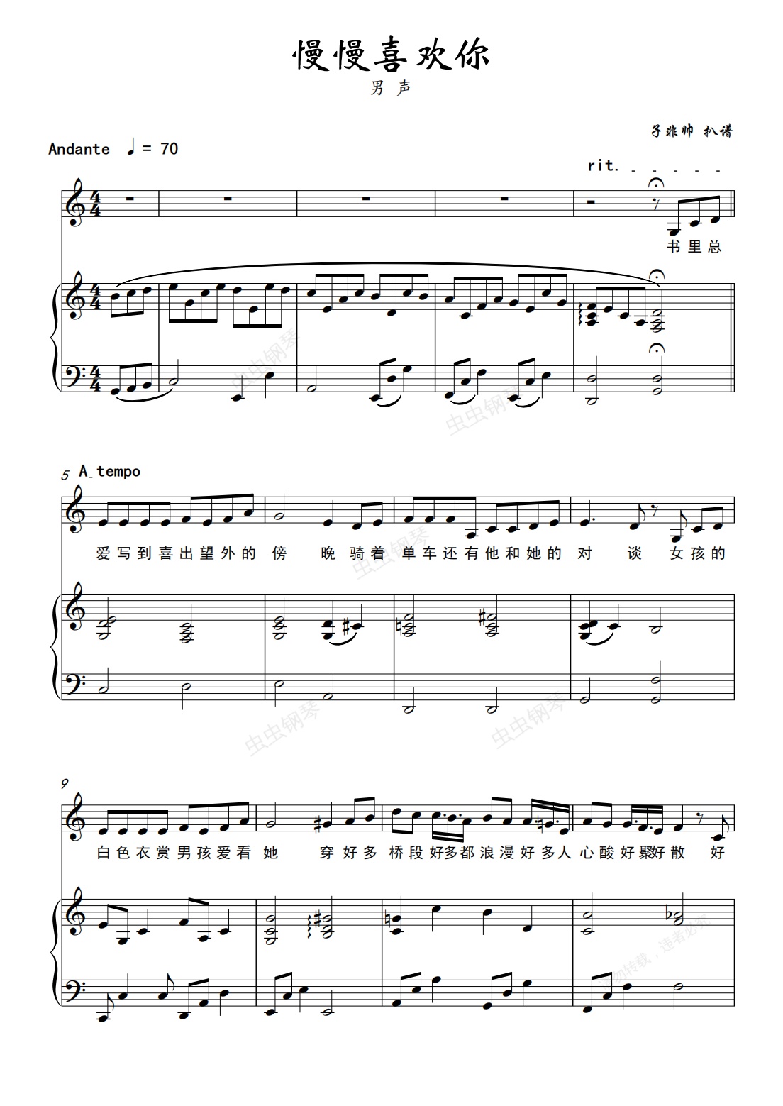 钢琴谱:慢慢喜欢你(男声)【C调】