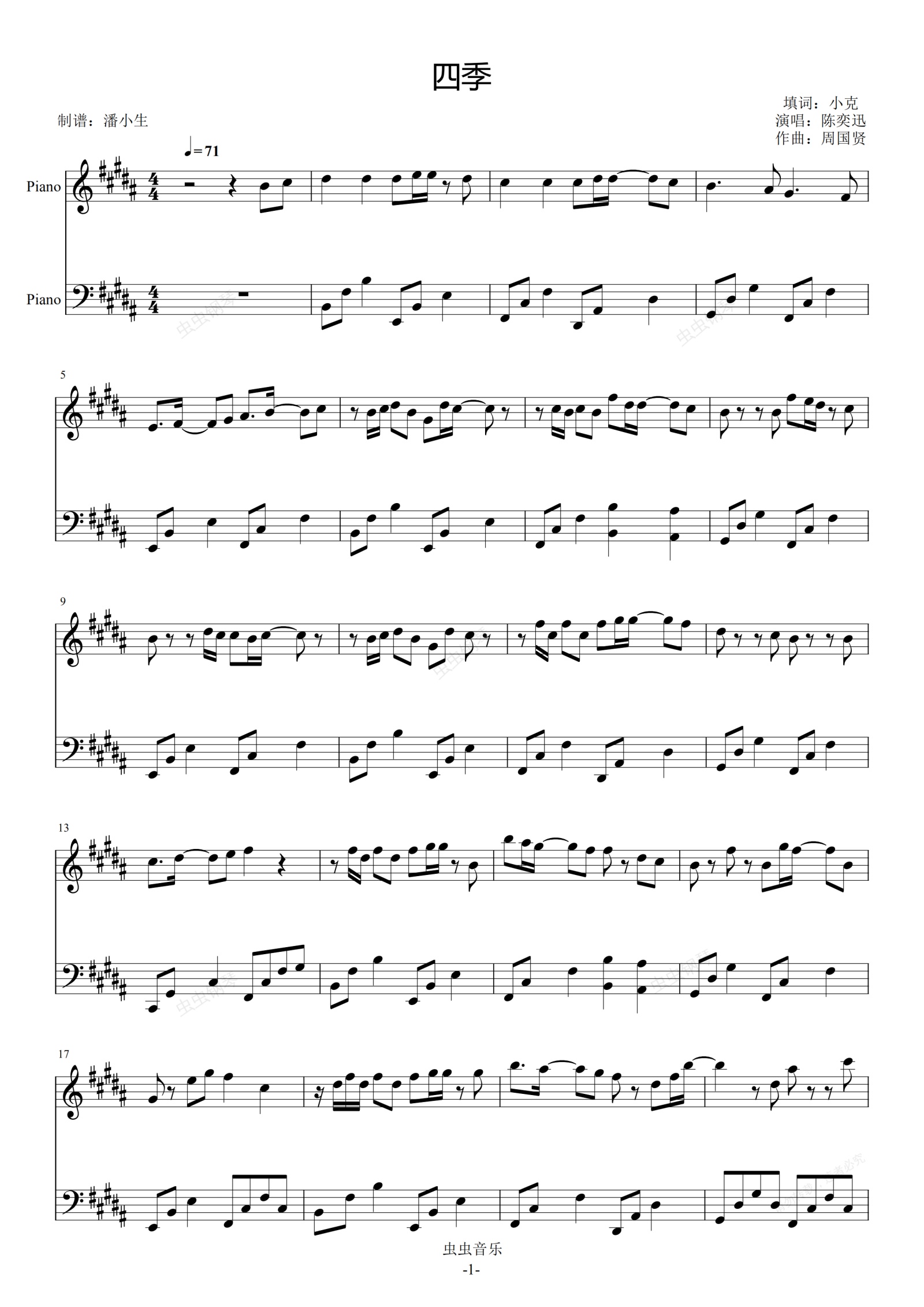 钢琴谱:四季 陈奕迅 原调 独奏版
