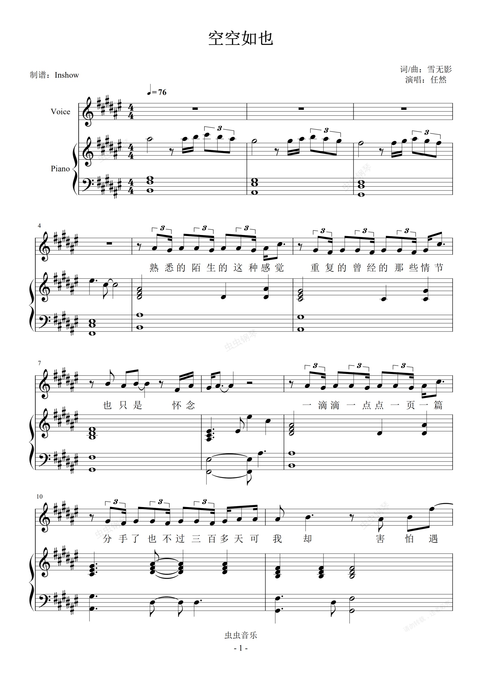 钢琴谱:任然 - 空空如也【弹唱谱】