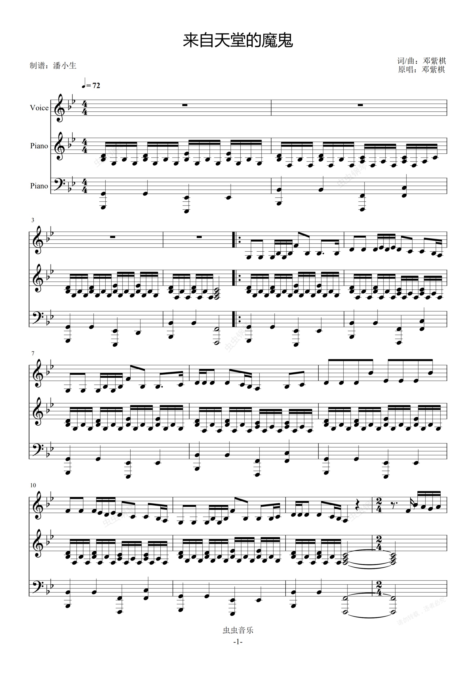 钢琴谱:来自天堂的魔鬼 伴奏弹唱版 Away