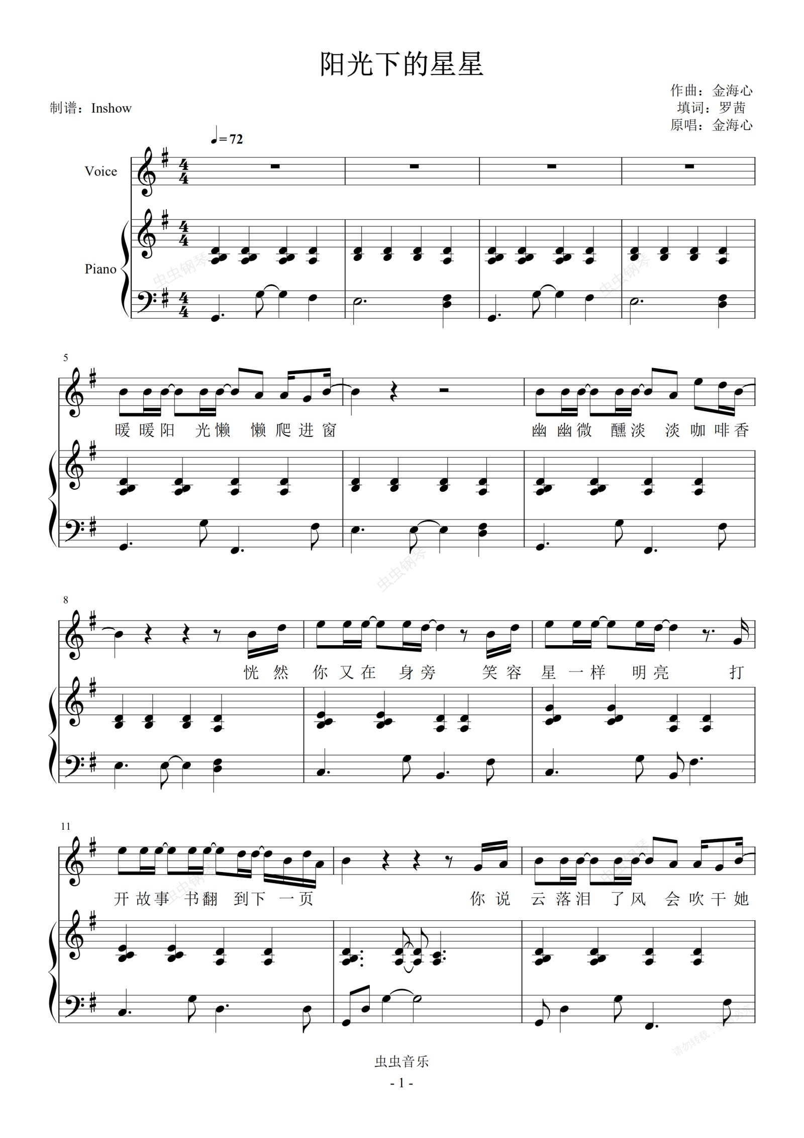 钢琴谱:金海心 - 阳光下的星星【弹唱谱】