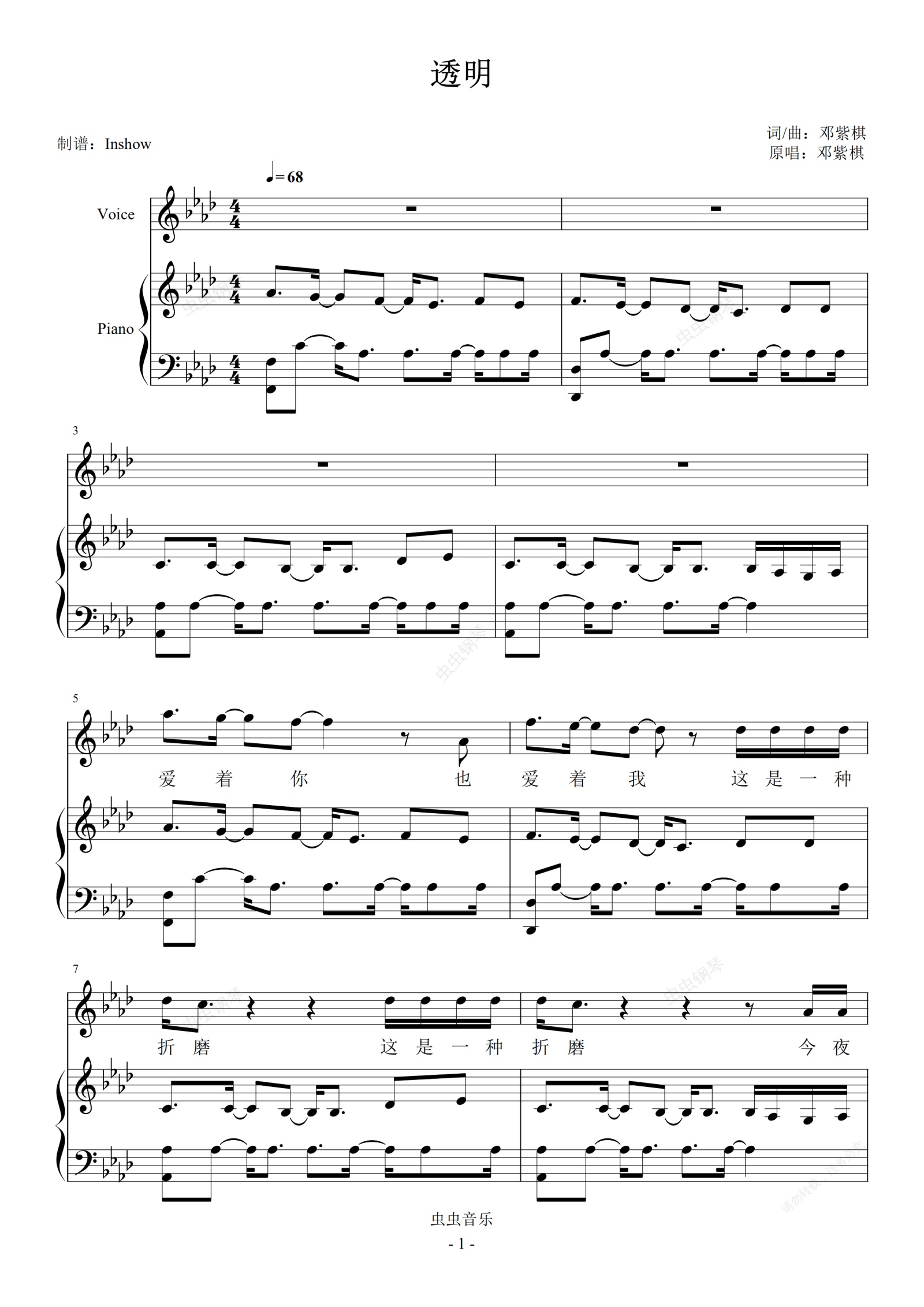 钢琴谱:G.E.M. 邓紫棋 - 透明【弹唱谱】
