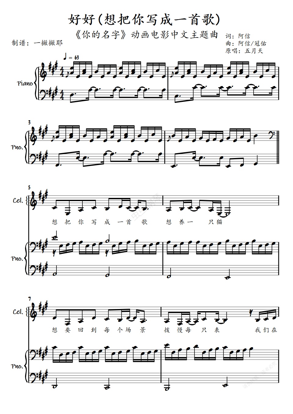 钢琴谱:好好【升调版弹唱谱】五月天《你的名字》「一撇撇耶」