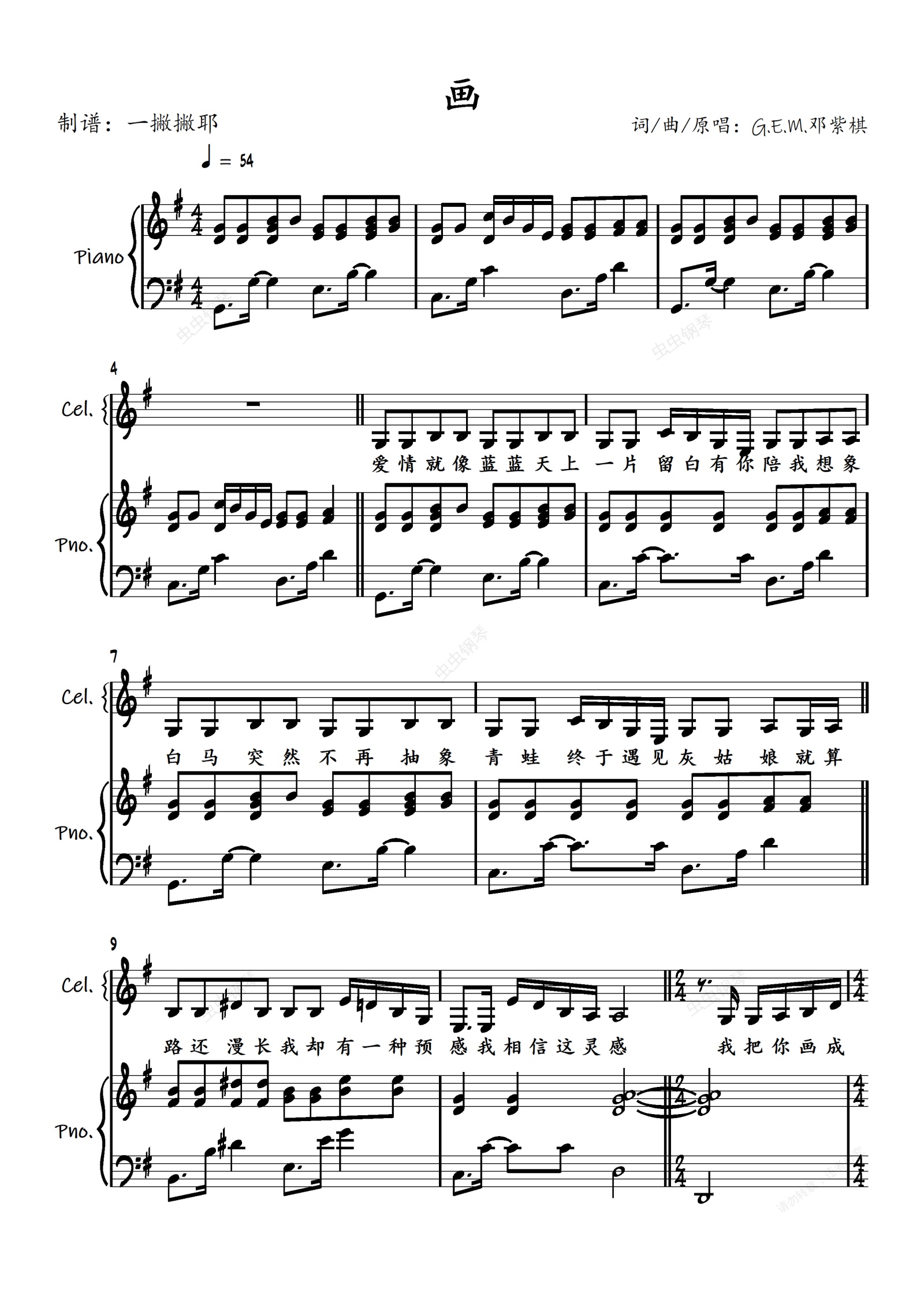 钢琴谱:画【降调版弹唱谱】G.E.M.邓紫棋「一撇撇耶」