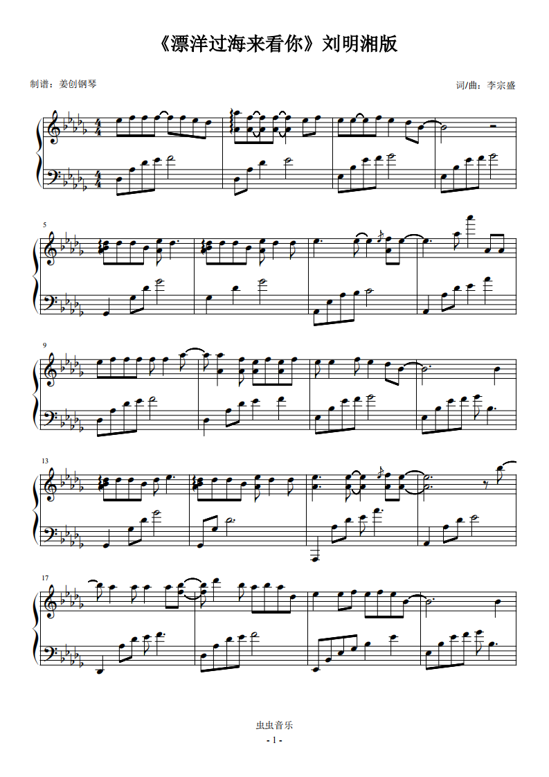 钢琴谱:刘明湘-《漂洋过海来看你》完美演奏版