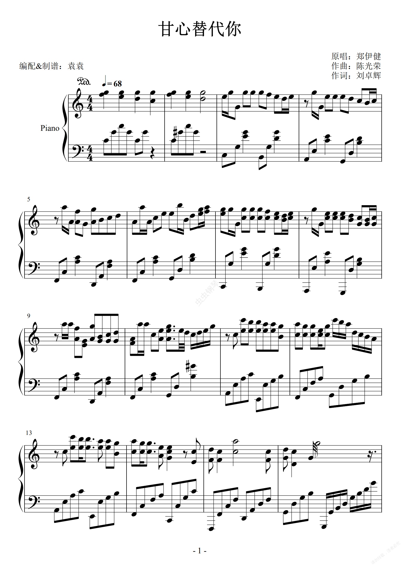 钢琴谱:甘心替代你(完美演奏版)