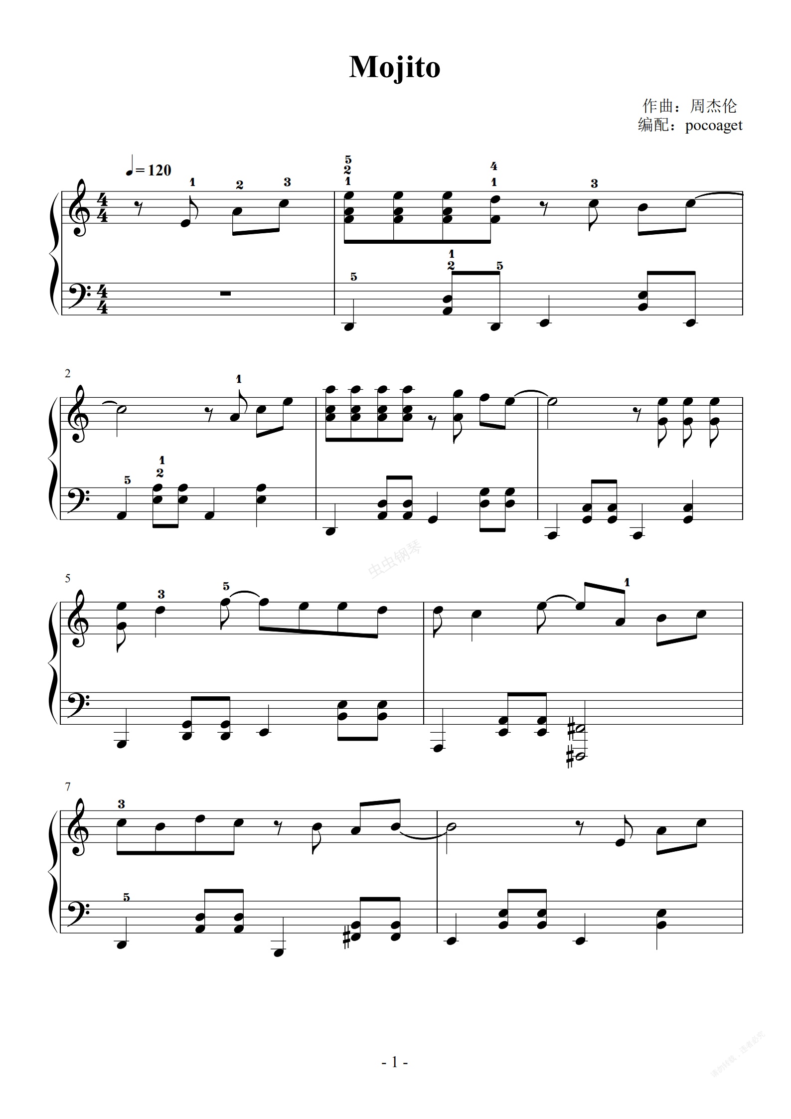 钢琴谱:周杰伦“mojito”原版C调带指法。适合初、中级人群(poc编配)