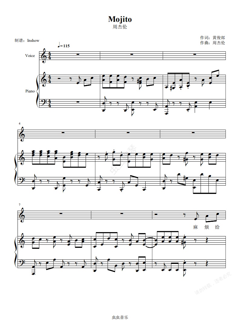 钢琴谱:周杰伦 - Mojito【弹唱谱】