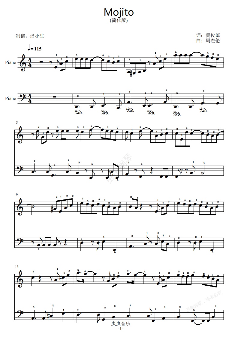 钢琴谱:MOJITO 完整指法 C调 周杰伦 新曲 简化版 初学者优选