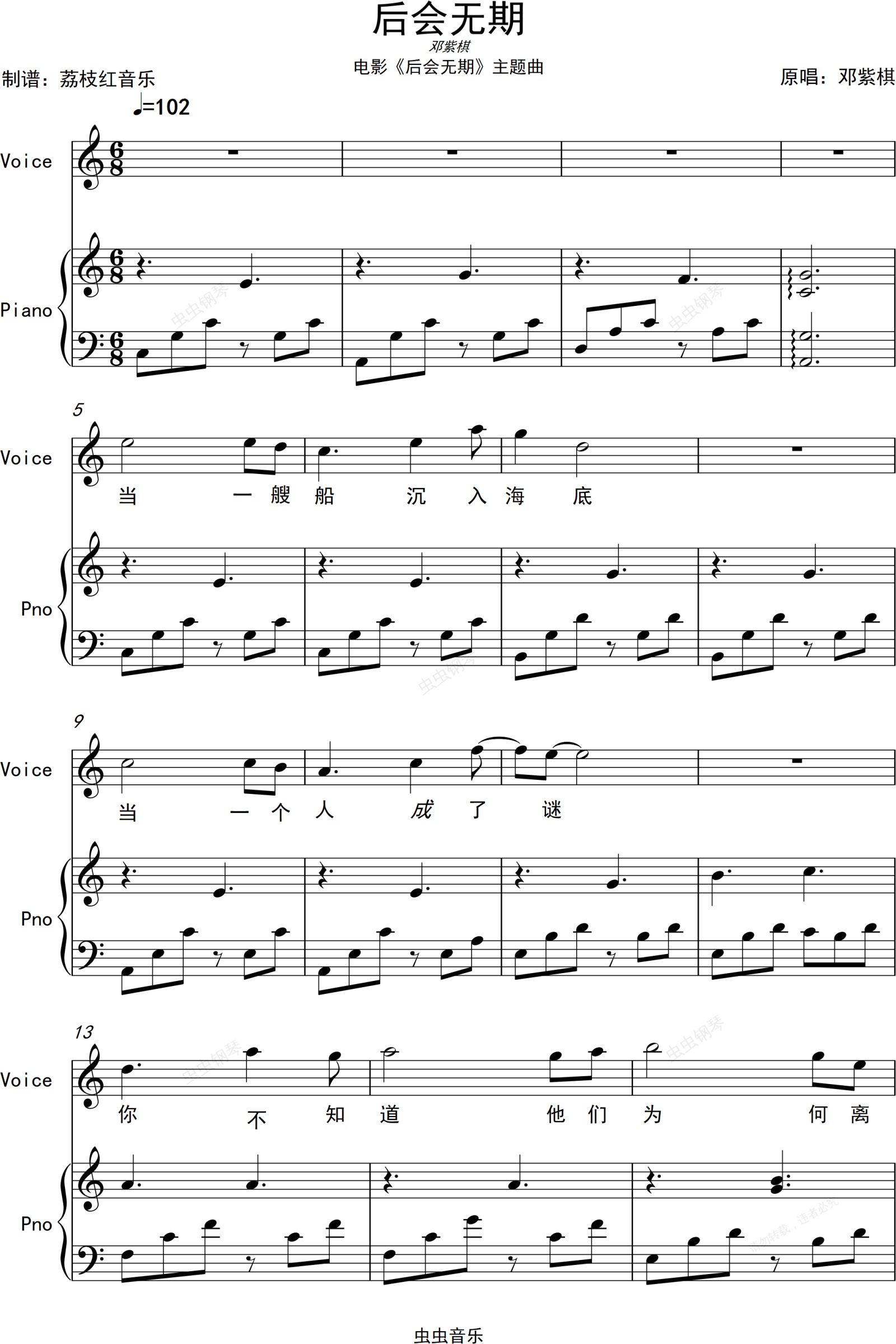 钢琴谱:后会无期 C大调完整版 钢琴伴奏谱(带歌词)-邓紫棋
