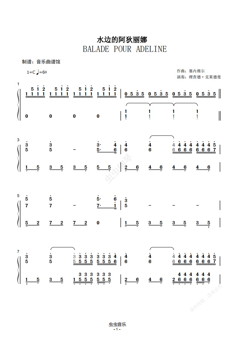 钢琴谱:水边的阿狄丽娜-【简谱】(BALADE POUR ADELINE 致爱德琳的诗 献给艾德琳的诗 理查德克莱德曼) 理查德·克莱德曼