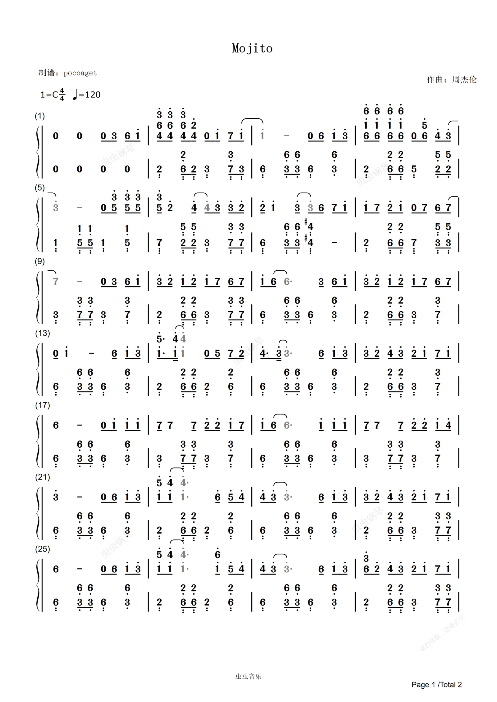 钢琴谱:“mojito”简谱版,原版C调带指法周杰伦。(poc编配)