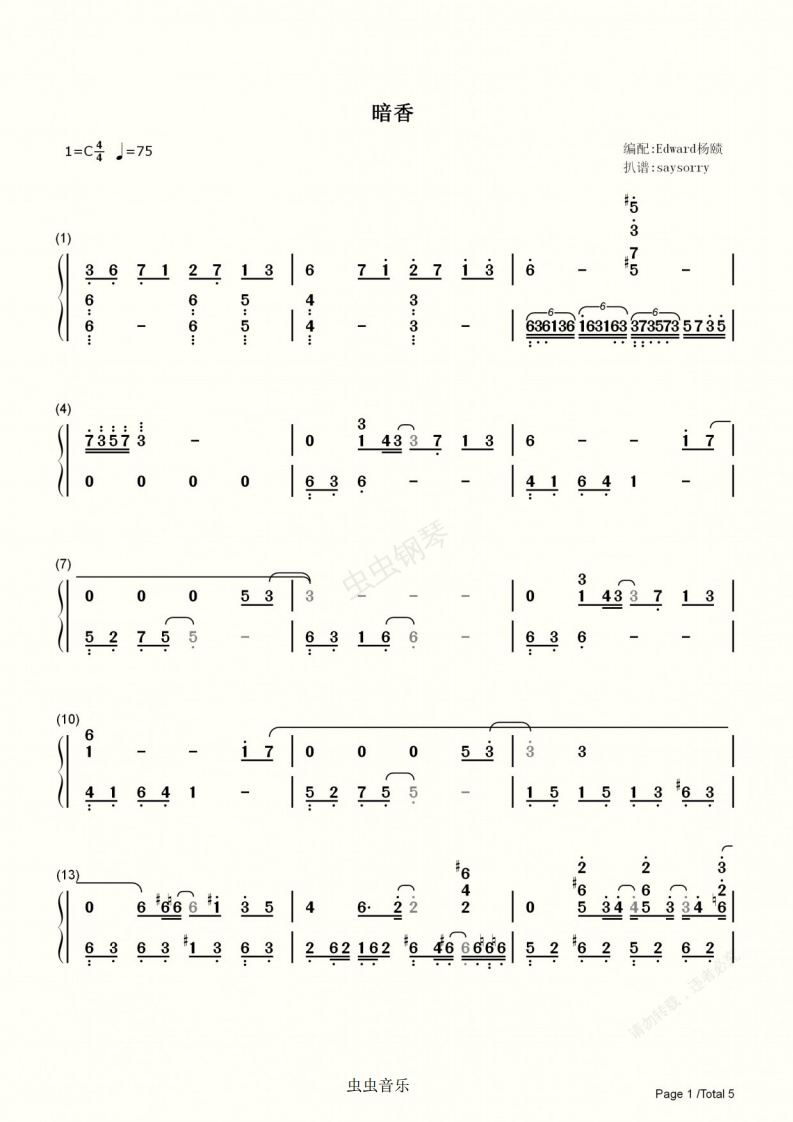 钢琴谱:【简谱】Edward杨赜版《暗香》独奏