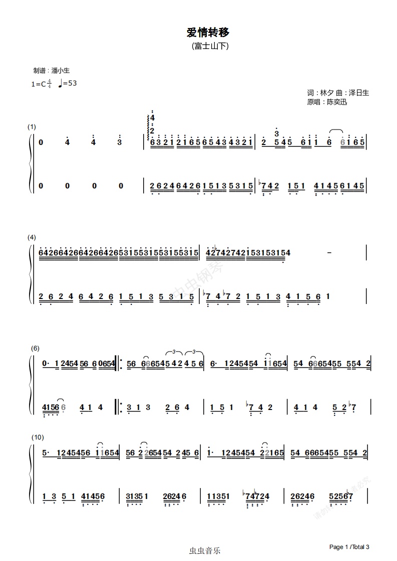 钢琴谱:[双手简谱] 爱情转移 C调 陈奕迅 富士山下