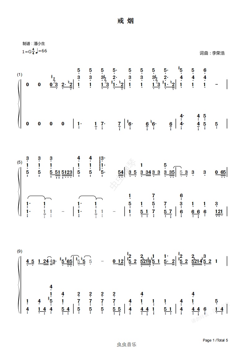钢琴谱:[双手简谱] 戒烟 原调 独奏版 李荣浩