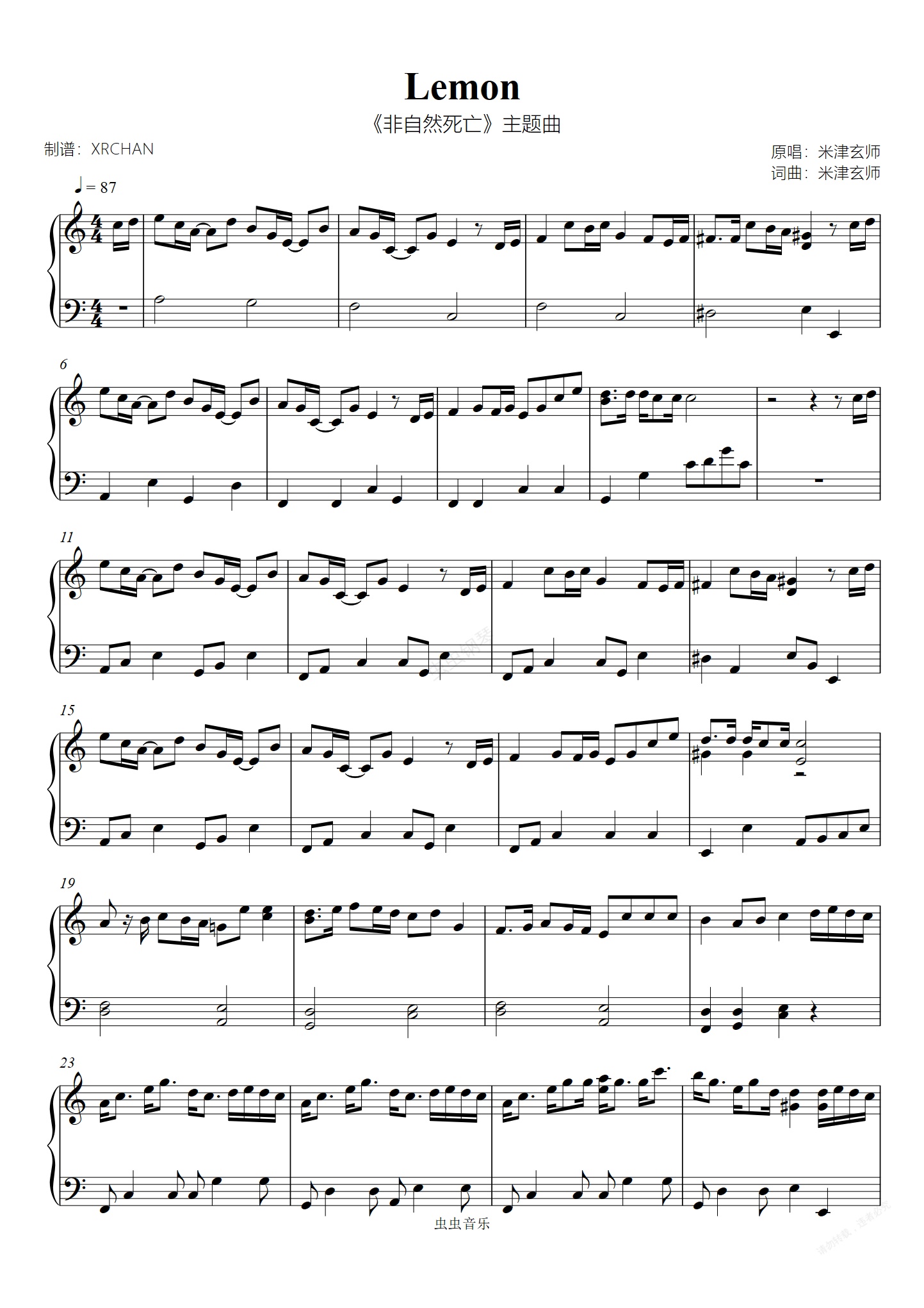 钢琴谱:Lemon 米津玄师 C调 好听 简单 中低难度《非自然死亡》主题曲