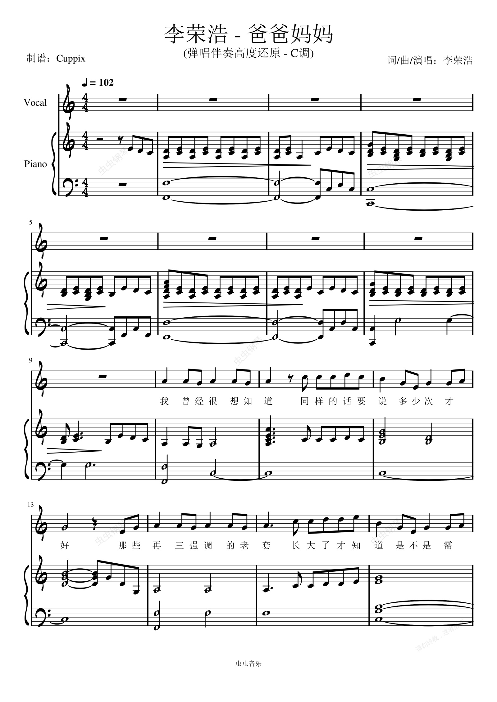 钢琴谱:李荣浩 - 爸爸妈妈(弹唱伴奏附词 - C调)超高还原版