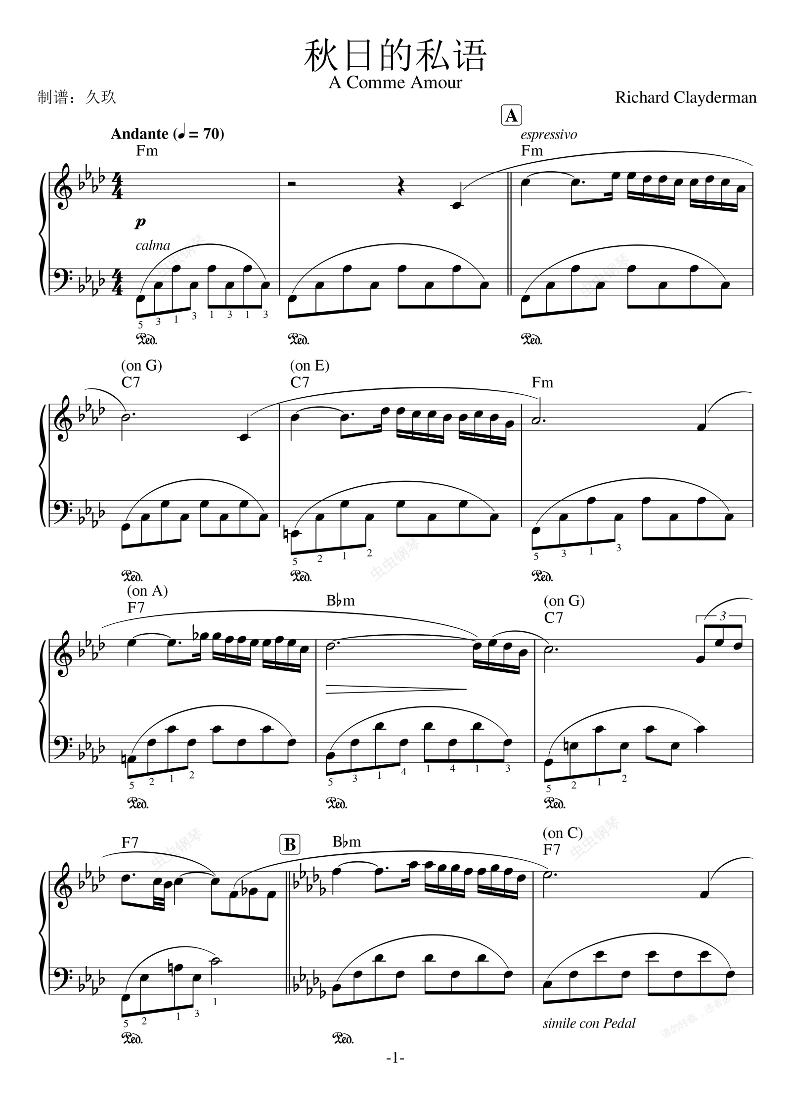 钢琴谱:秋日的私语(原版带指法)理查德·克莱德曼 Richard Clayderman 理查德克莱德曼 A Comme Amour