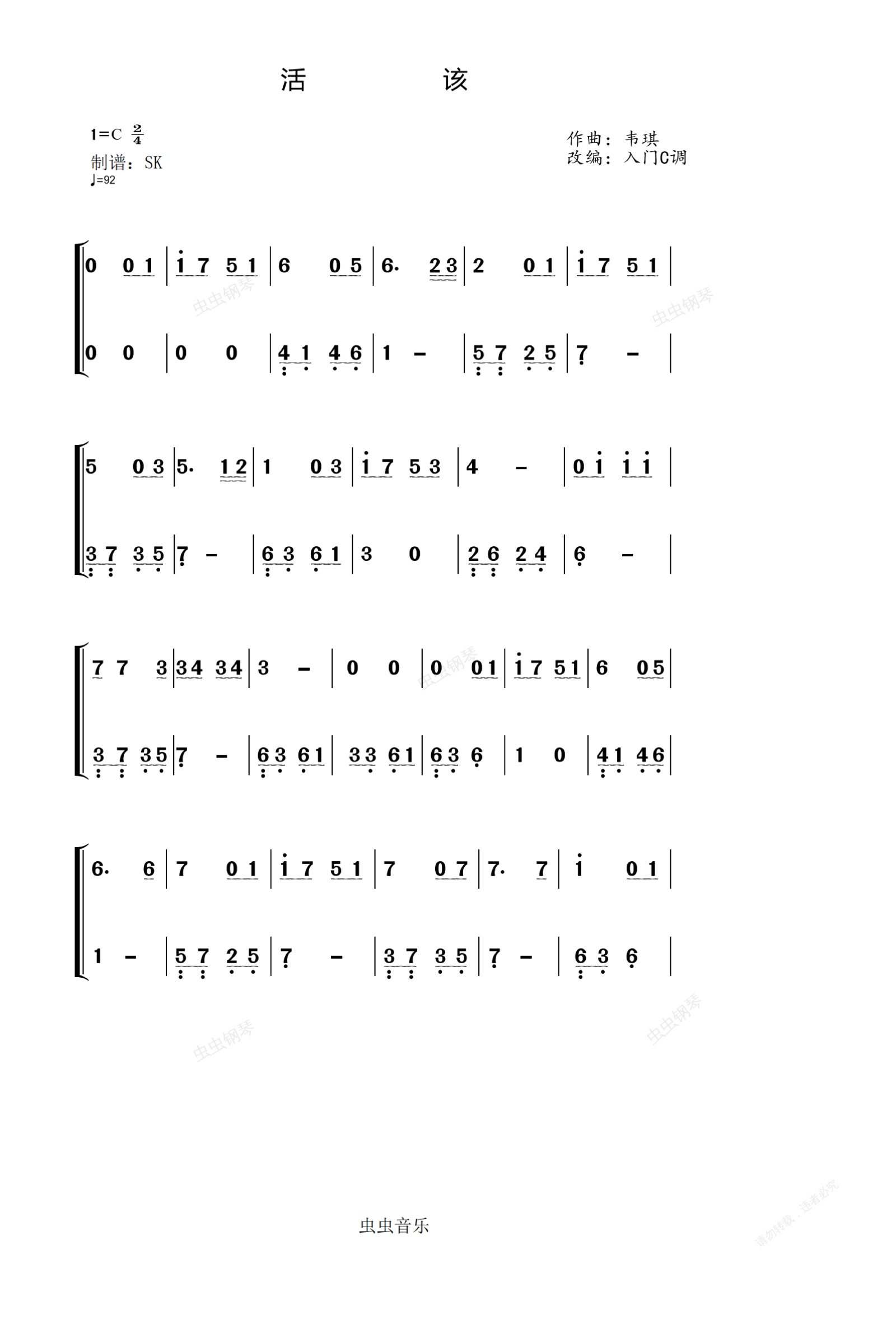 钢琴谱:谌宥《活该》入门C调简谱