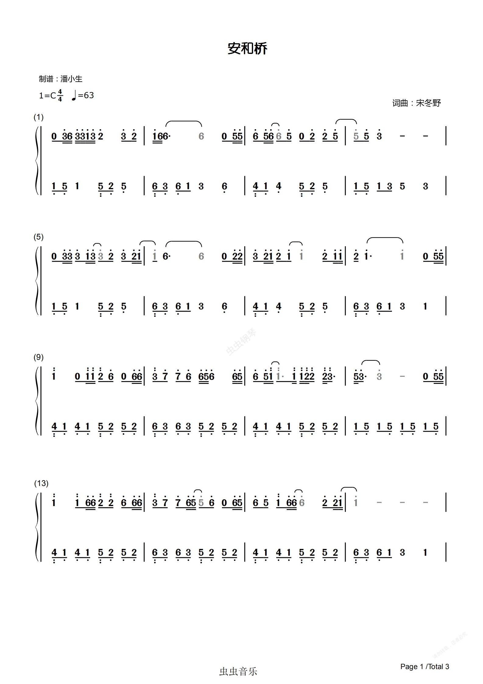 钢琴谱:[双手简谱] 安和桥 C调 简单版 宋冬野