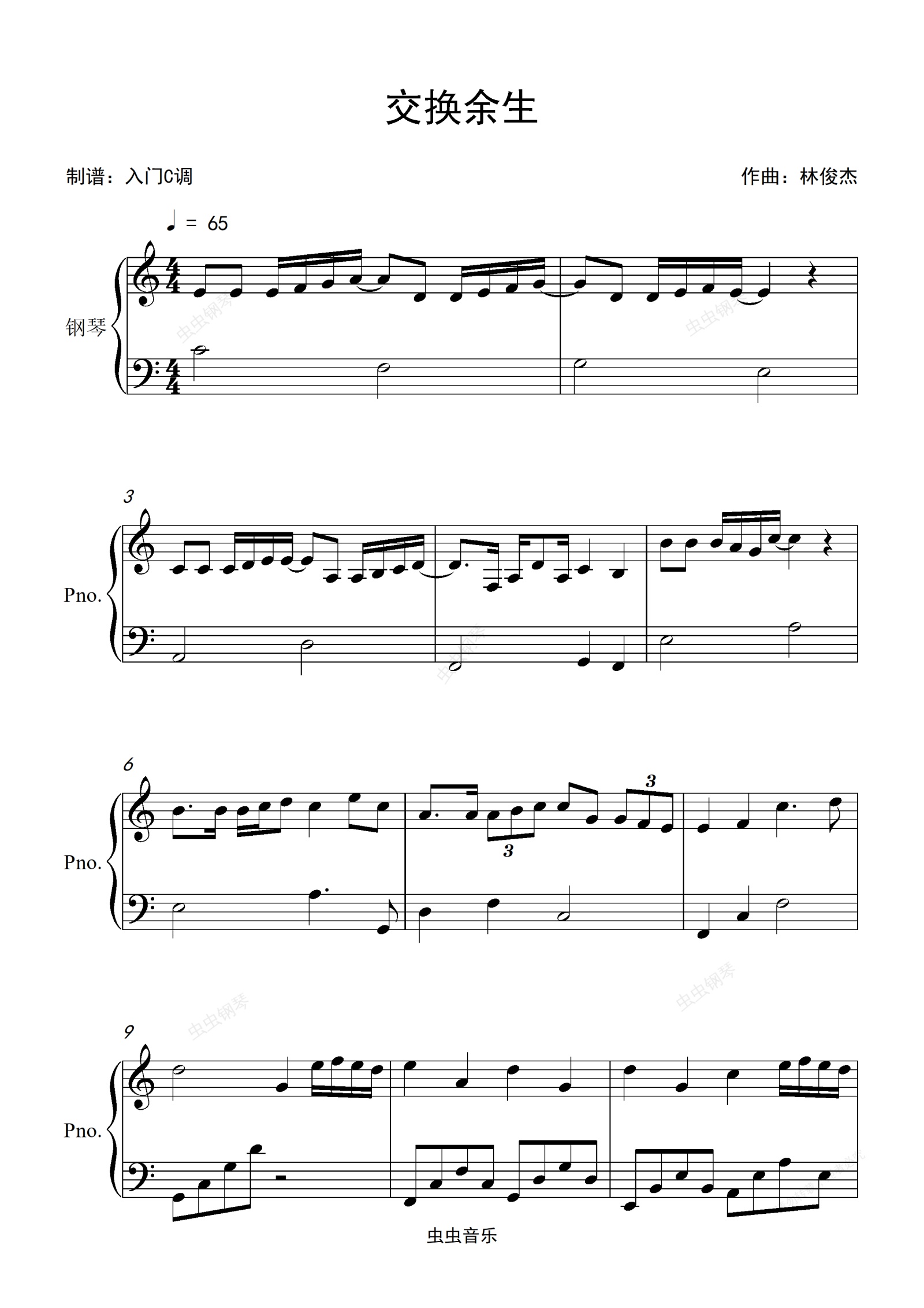 钢琴谱:林俊杰《交换余生》C调简单版