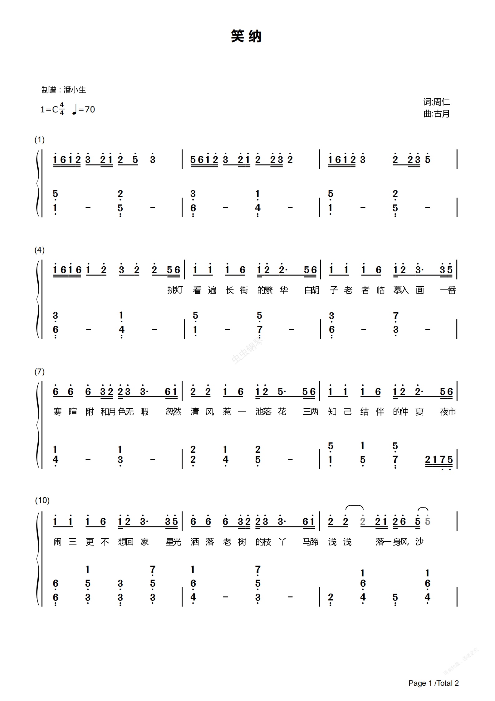 钢琴谱:[双手简谱] 笑纳 C调 简化版 独奏版 带歌词 花僮 公子是你吗