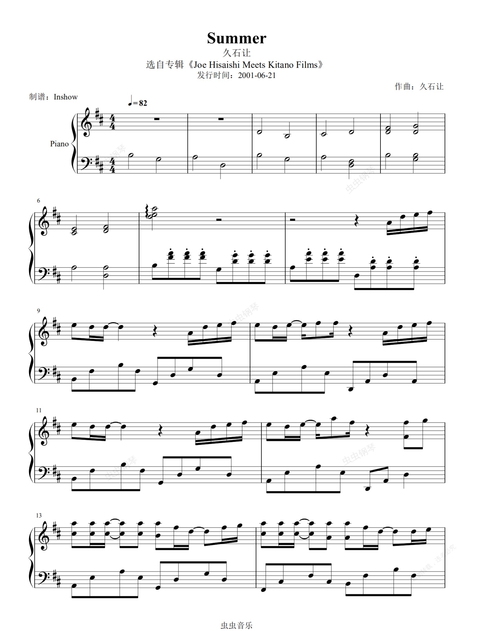 钢琴谱:久石让 - Summer (选自专辑《Joe Hisaishi Meets Kitano Films》)(《菊次郎的夏天》电影主题曲)