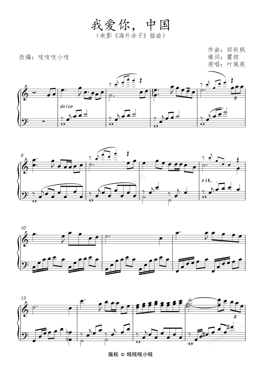 钢琴谱:我爱你,中国 C调简易独奏版 电影《海外赤子》的插曲