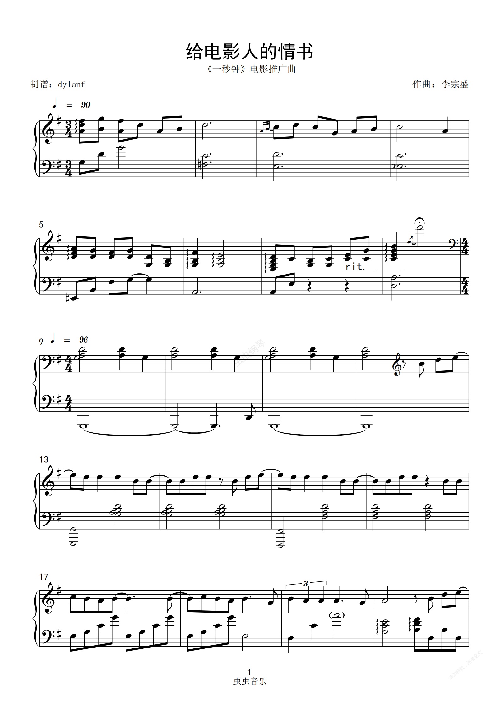 钢琴谱:单依纯 给电影人的情书 中国好声音 电影《一秒钟》