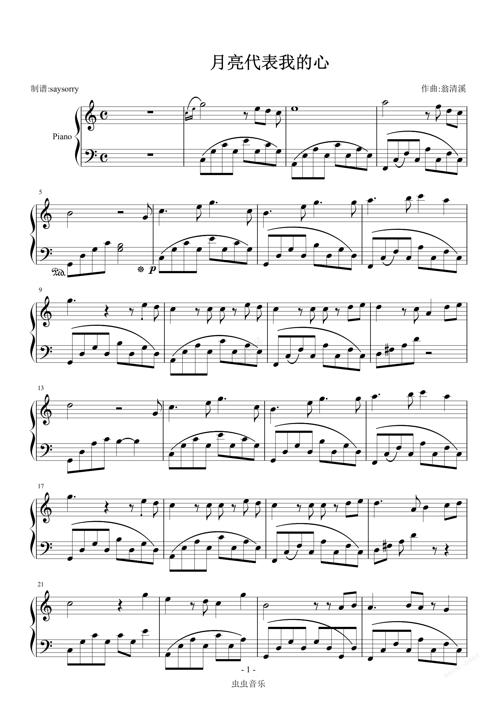 钢琴谱:《月亮代表我的心》十度伴奏法简单好弹