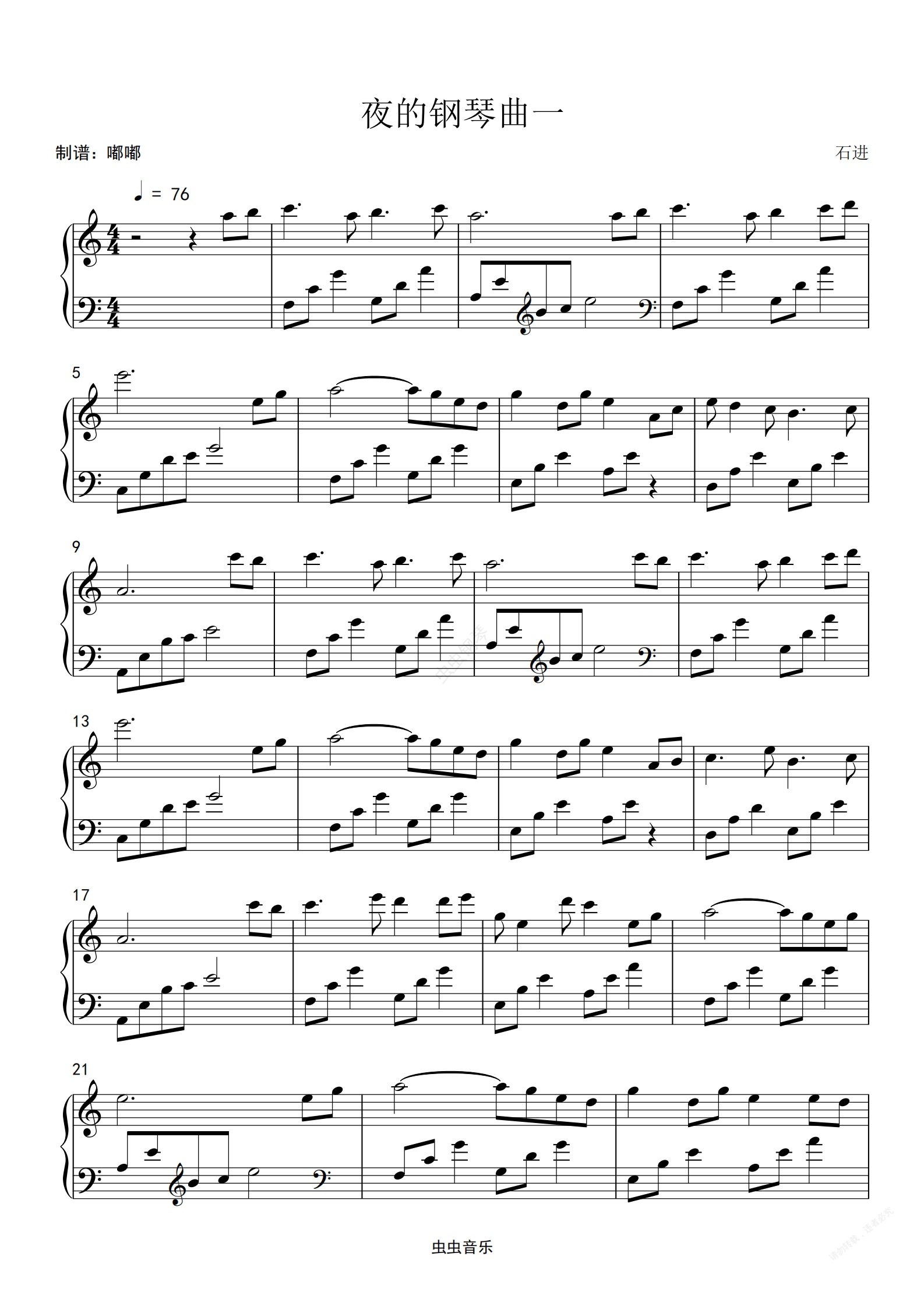 钢琴谱:夜的钢琴曲一(C 调)(简单教学版)