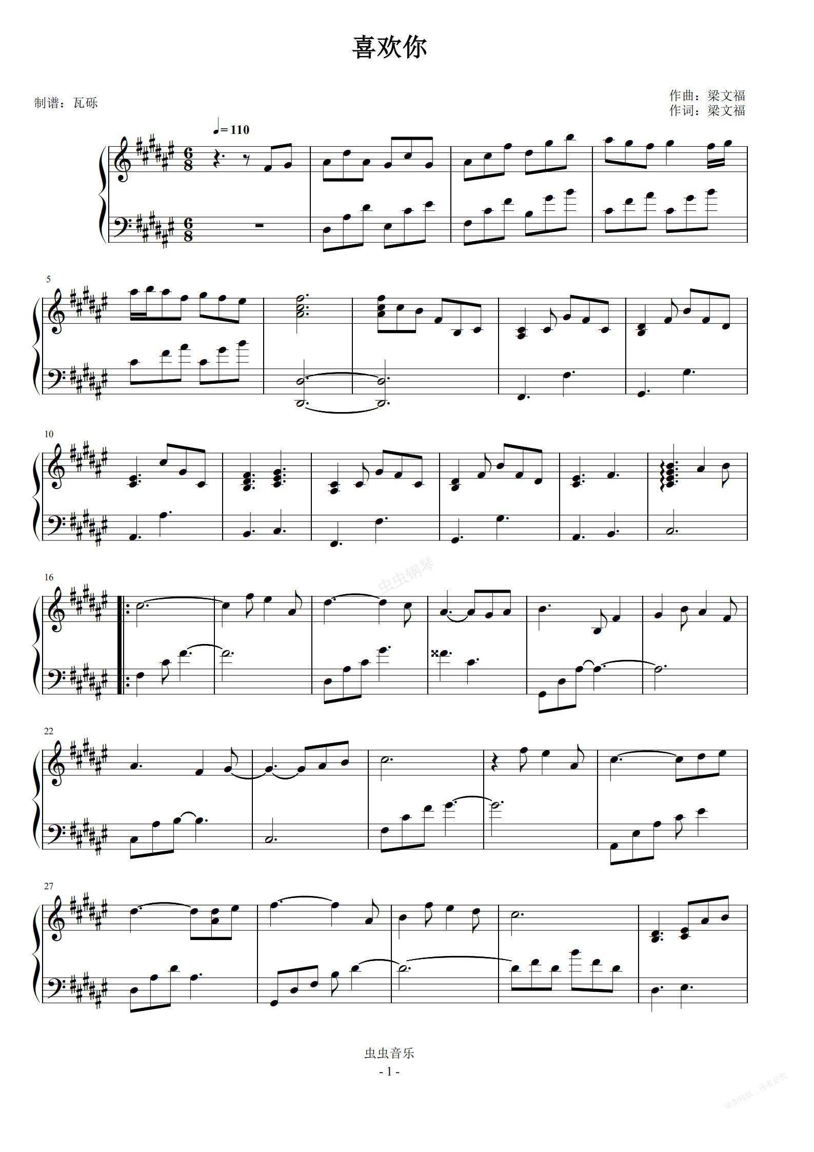 钢琴谱:喜欢你
