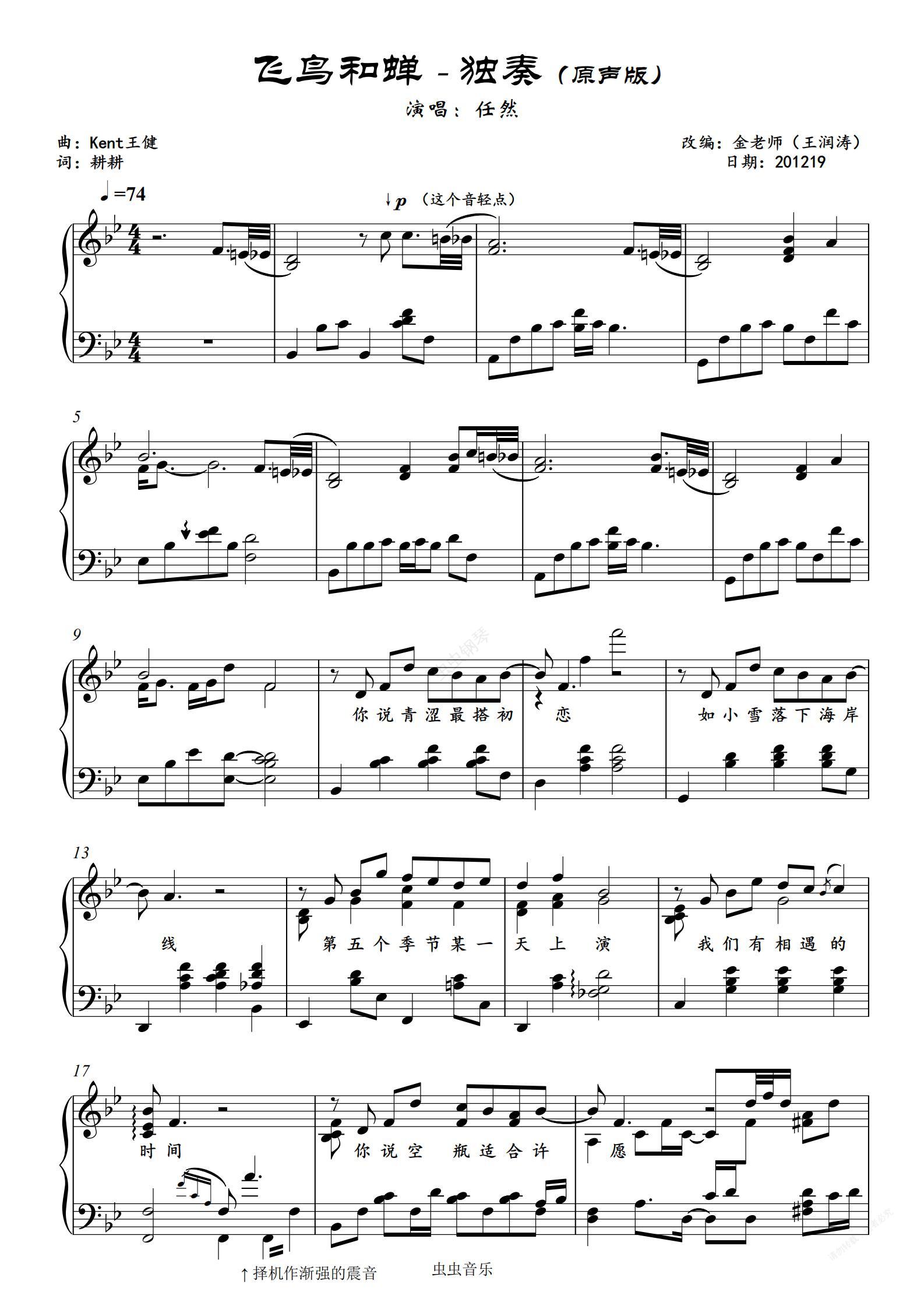 钢琴谱:飞鸟和蝉-金老师原声独奏谱