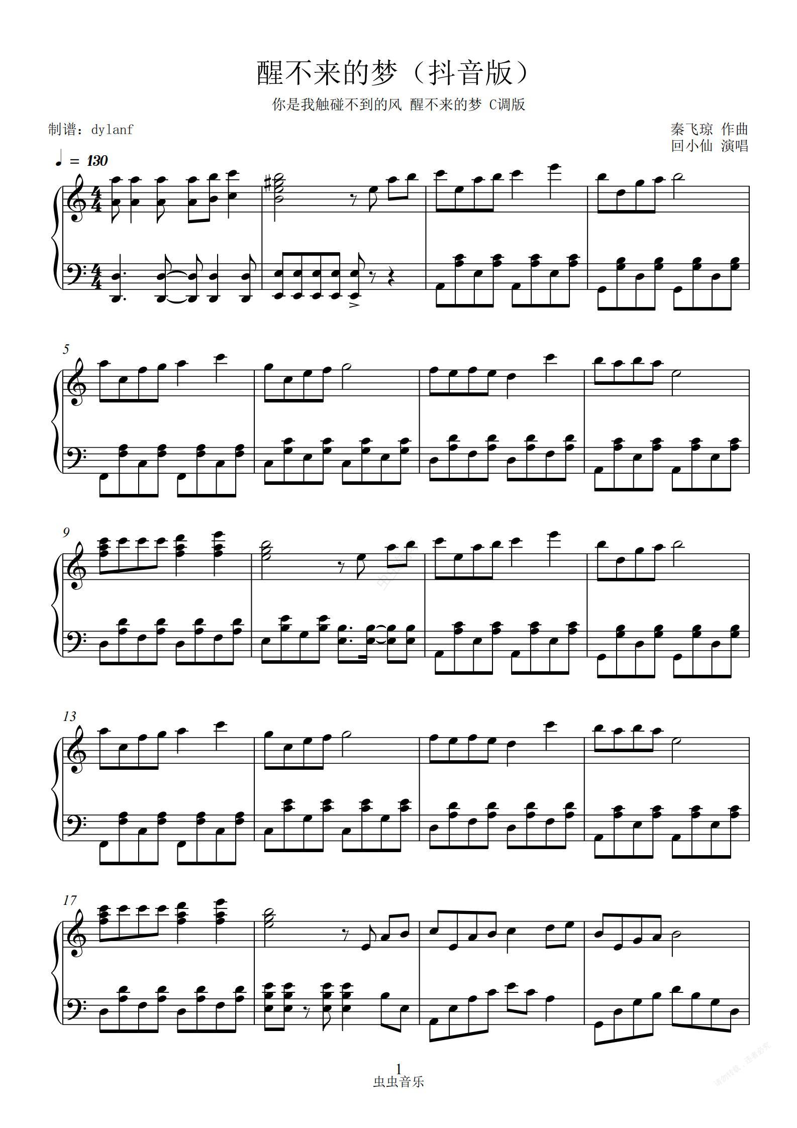 钢琴谱:C调易弹 醒不来的梦(抖音版)回小仙