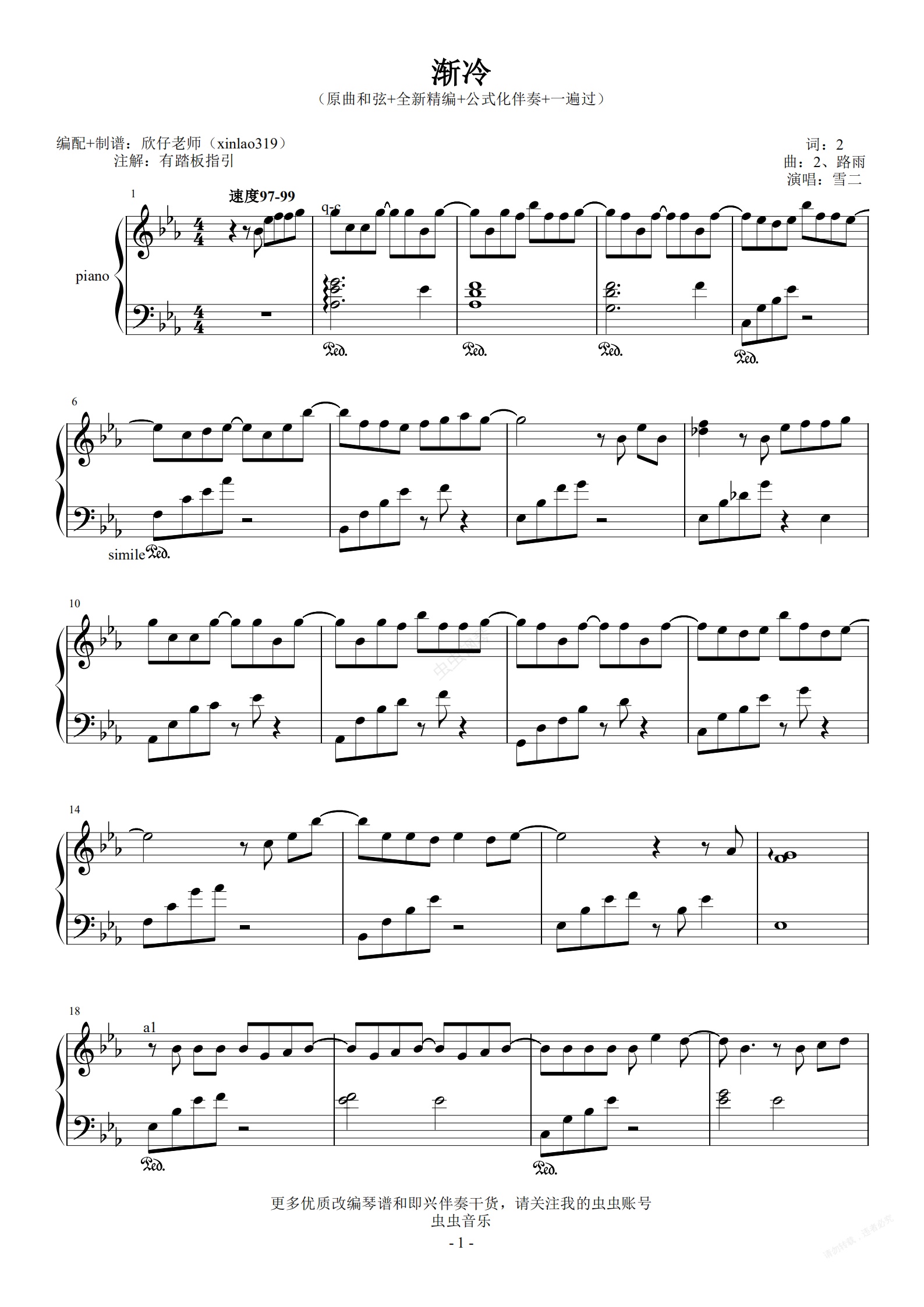 钢琴谱:雪二-降E-《渐冷》(原曲和声+全新精编+公式化伴奏+一遍过)