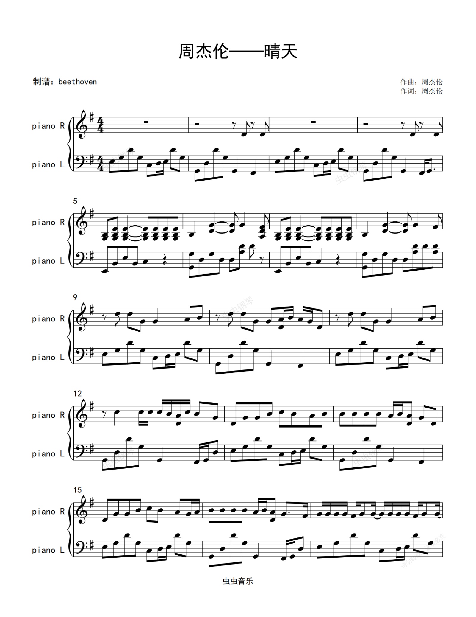 钢琴谱:晴天(简单易弹动听)_周杰伦